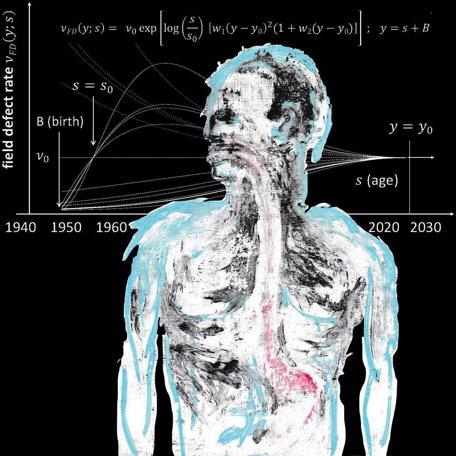 Caption: Our recent mathematical analyses of incidence patterns suggest that esophageal squamous cell carcinoma (ESCC) is likely associated with a premalignant field that may develop very early in life and is under the influence of strong historic trends, which vary by sex and race. In the image, an organic human form with esophagus stands in front of our Figure illustrating a new functional regularization method for handling period trends, with some randomly generated trajectories for field defect (FD) onset rates. See full publication in PLoS Computational Biology here.