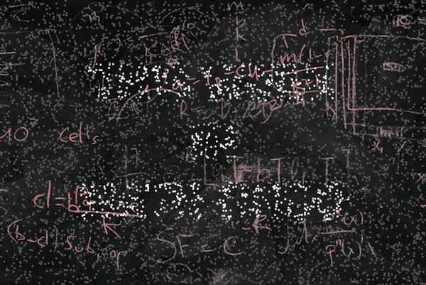 Caption: The letters of the text “This week in MathOnco” provide a chemotactic signal for migrating cells (in white). Cells within basins of high concentration are allowed to proliferate and expand to fill the domain. After some time, the chemotactic signal changes to display “1000” to celebrate 1000 subscribers to the newsletter. Built in HAL, using off-lattice, agent-based grids in combination with PDE grids.