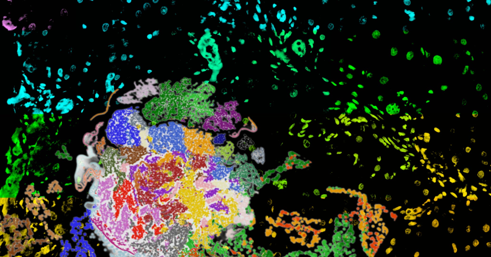 Caption: Multiscale Spatial Analysis (MSA) involves extracting and examining spatial information from data across multiple scales—such as images, quadrats, and cells. This cover art provides a conceptual visualization of MSA using multi-stain images from Lung cancer. The background image is a risk map: a single multi-stain image depicting gradients of disease-progression probabilities, computed by inferring the spatial neighborhoods of cells and quadrats. The foreground features a collage of t-SNE renderings of cells and quadrats extracted from several such multi-stain images. In our paper, we show that integrating localized information with a broader spatial context can improve predictions of disease progression.